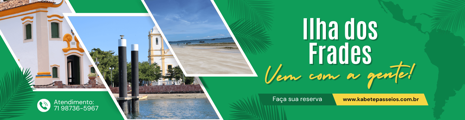 Na Kabete Passeios, você encontra roteiros variados e cuidadosamente planejados para mostrar o melhor que Salvador tem a oferecer — praias paradisíacas, ilhas encantadoras e paisagens que vão ficar para sempre na sua memória. Trabalhamos com dedicação para garantir atendimento de qualidade e a sua total satisfação em cada momento do passeio.
